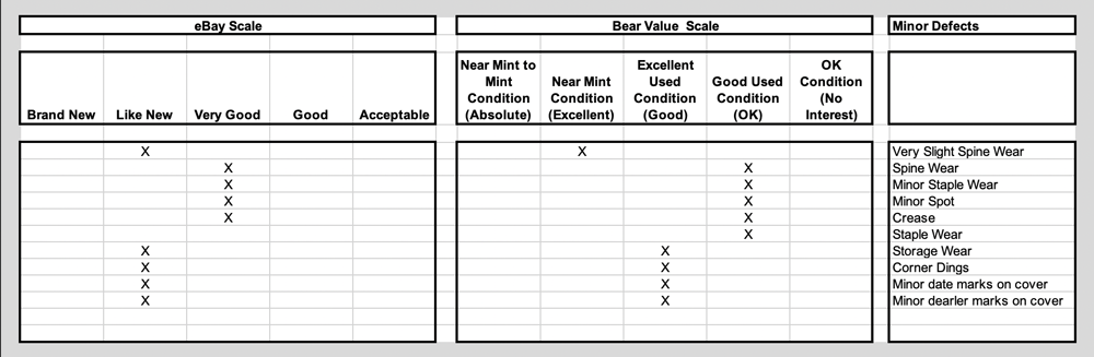 Any minor deviation from the absolute best quality magazines were mapped into the quality definitions on the eBay and Bear Value scales using the criteria in the following table.