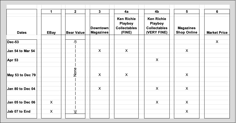 Not all price lists were available in every year. In most cases, 3 of the 4 separate price lists were used to determine value. For the more current issues (Jan 2007 to Winter 2020), only 2 price lists were used. However, these later magazines are all mint. The following Table shows the specific magazine price lists used for each year. The 1st Issue, Dec 1953, was priced based on market value.