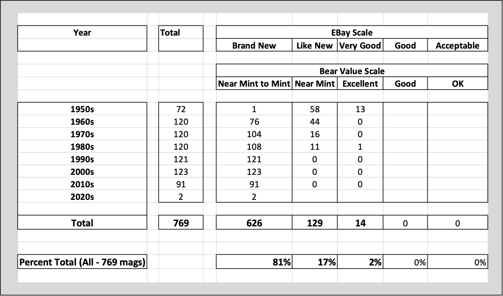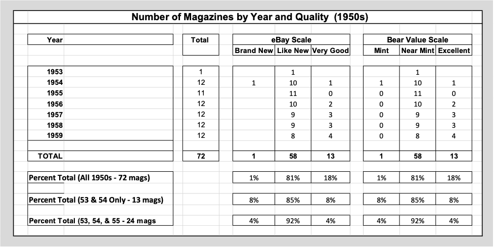 To help quantify the quality of The Collection, I have taken the five eBay quality definitions (Brand New, Like New, Very Good, Good, Acceptable) and the five Bear Value quality definitions (Near Mint to Mint, Near Mint, Excellent, Good, OK) to develop quality metrics. These metrics show both the total and percent total of magazines in the 1950 decade and the total and percent total of magazines in the entire collection that are in the Top 2 Categories for the eBay and Bear Value quality definitions.