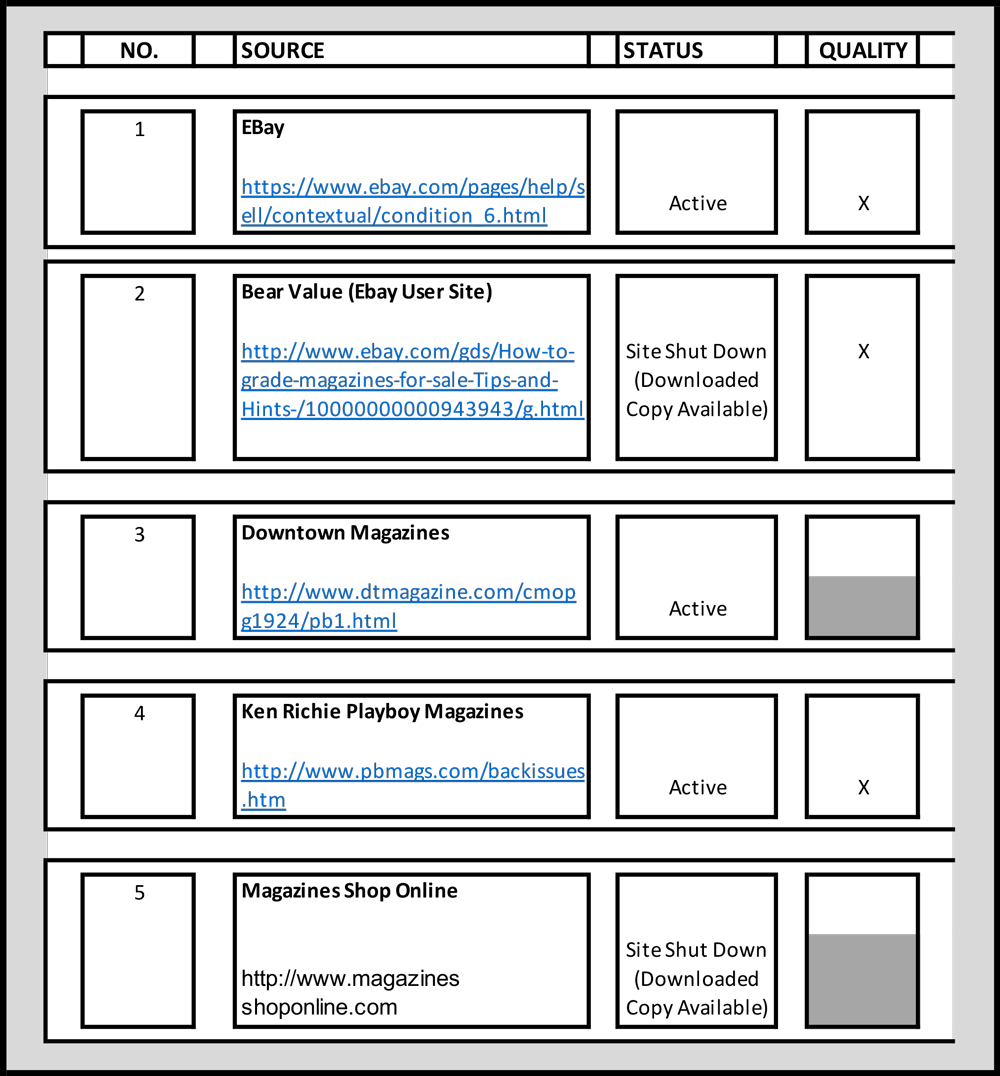 This Playboy Collection was graded on 3 separate sources for quality definitions and priced on 3 of 4 different price lists (See Quality and Price Source Tables below). The quality assessment was performed repeatedly over the last 40 years (1980-to 2020) as I upgraded magazines in the collection. Some of the sites for quality definitions, I chose long ago, have now shut down, but I had downloaded copies of every definition that were used. ( See the downloaded site data in References )